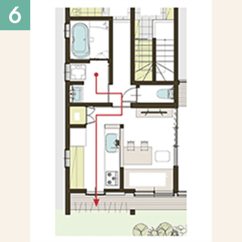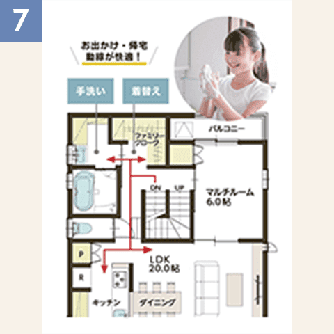 階段を上がってすぐ手洗い・着替えができる動線。キレイになって室内へ。お出かけ・帰宅の動きがスムーズに。