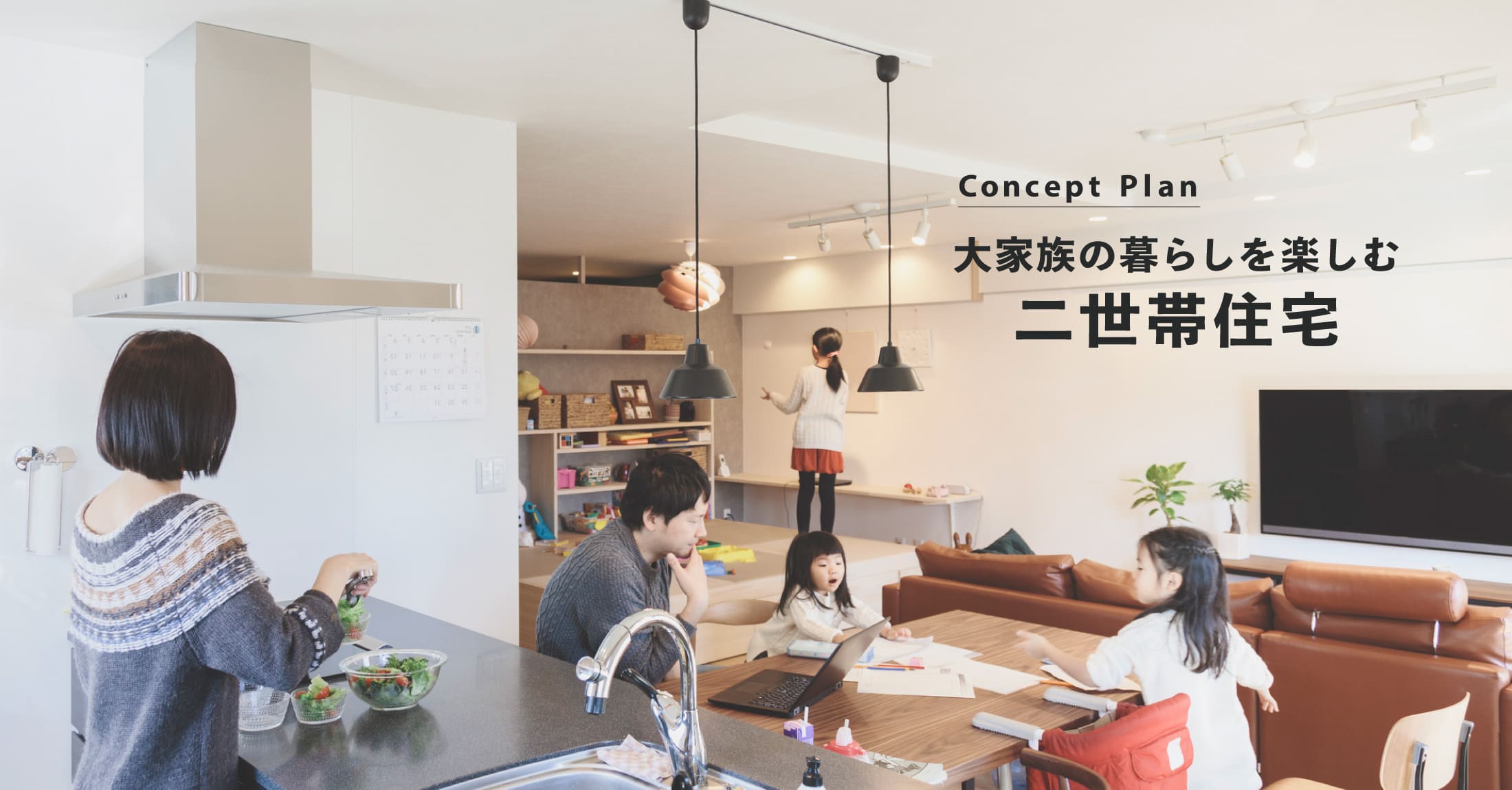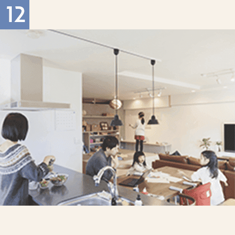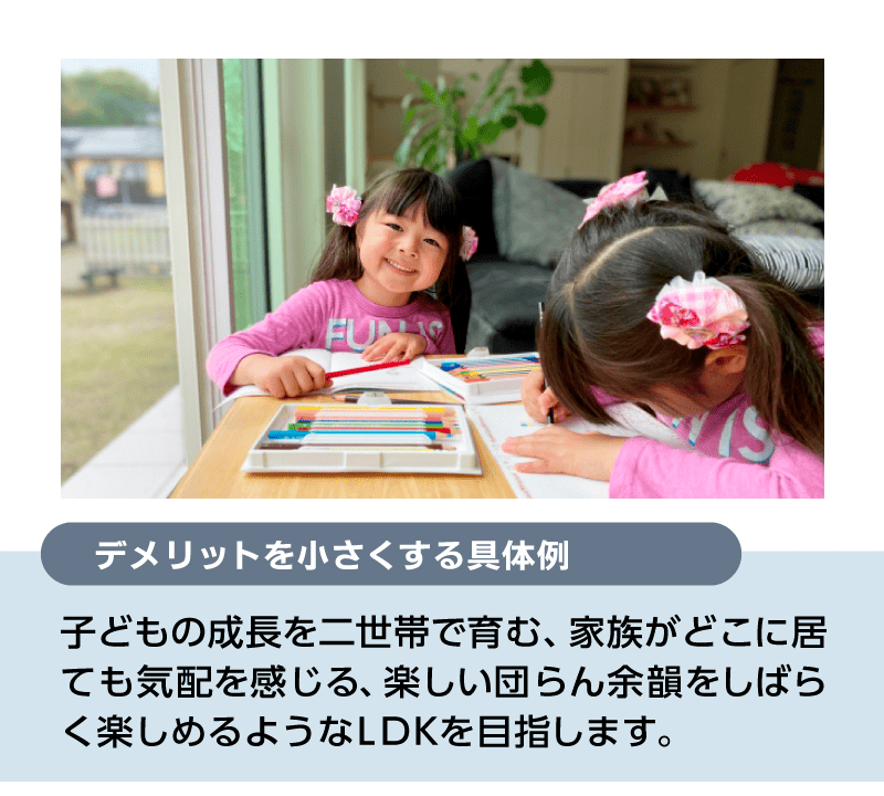 共有空間はミニマムにして、生活様式の違いを尊重しながら、2世帯が触れ合うLDKを充実します。一方で「この時間」を気兼ねなく過ごせるように配慮します。
